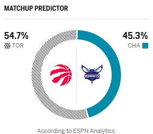 赛前,美媒ESPN预测本场比赛,猛龙胜率54.7%,黄蜂胜率45.3%。